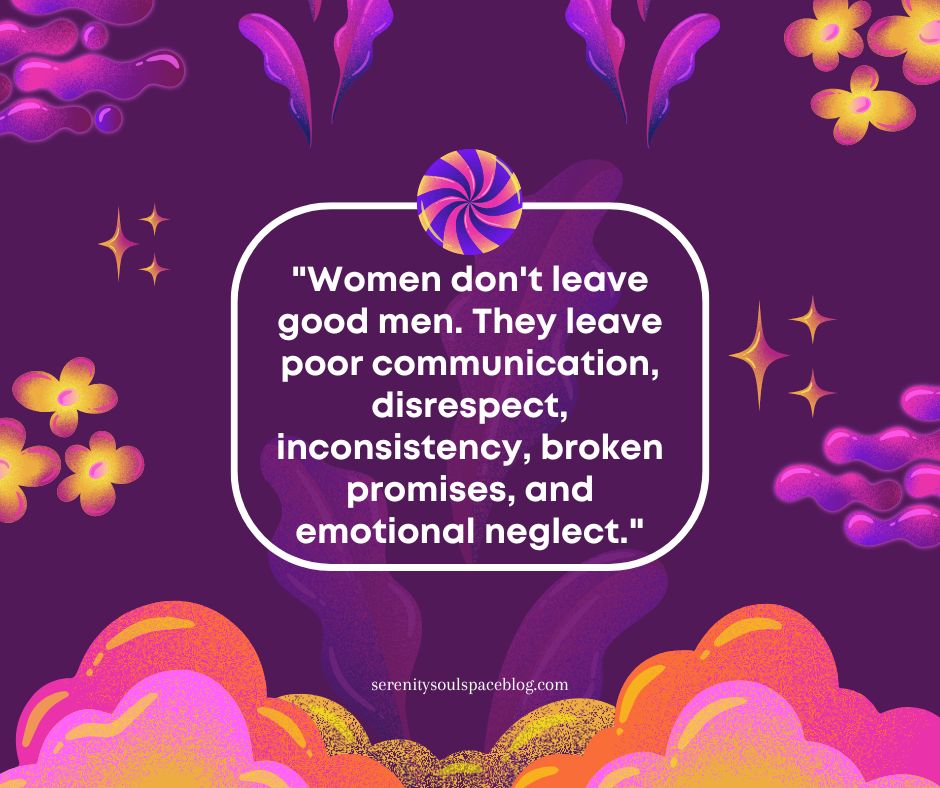 21. “Women don’t leave good men. They leave poor communication, disrespect, inconsistency, broken promises, and emotional neglect.”