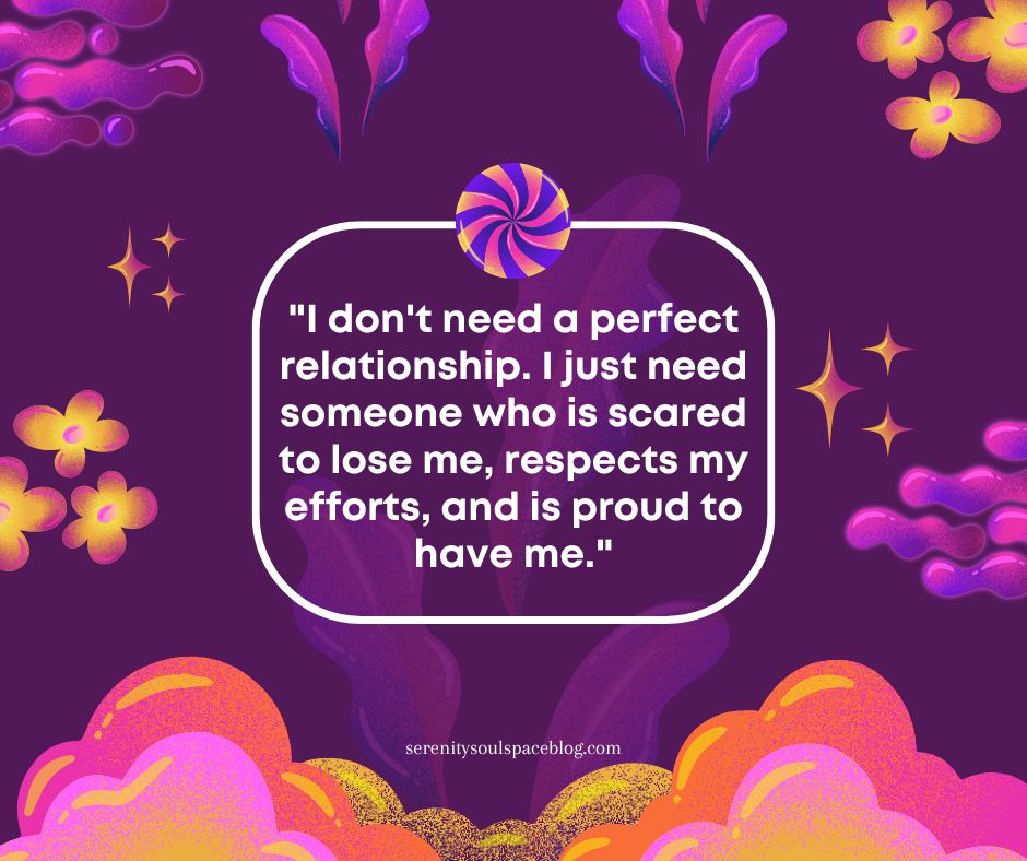 - “I don’t need a perfect relationship. I just need someone who is scared to lose me, respects my efforts, and is proud to have me.”