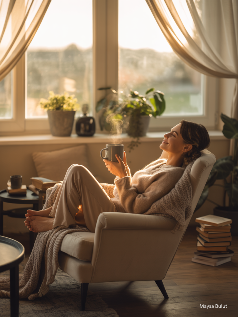 Light a soft lamp, pull a blanket over your legs, sip something warm, and let your body settle for a moment.